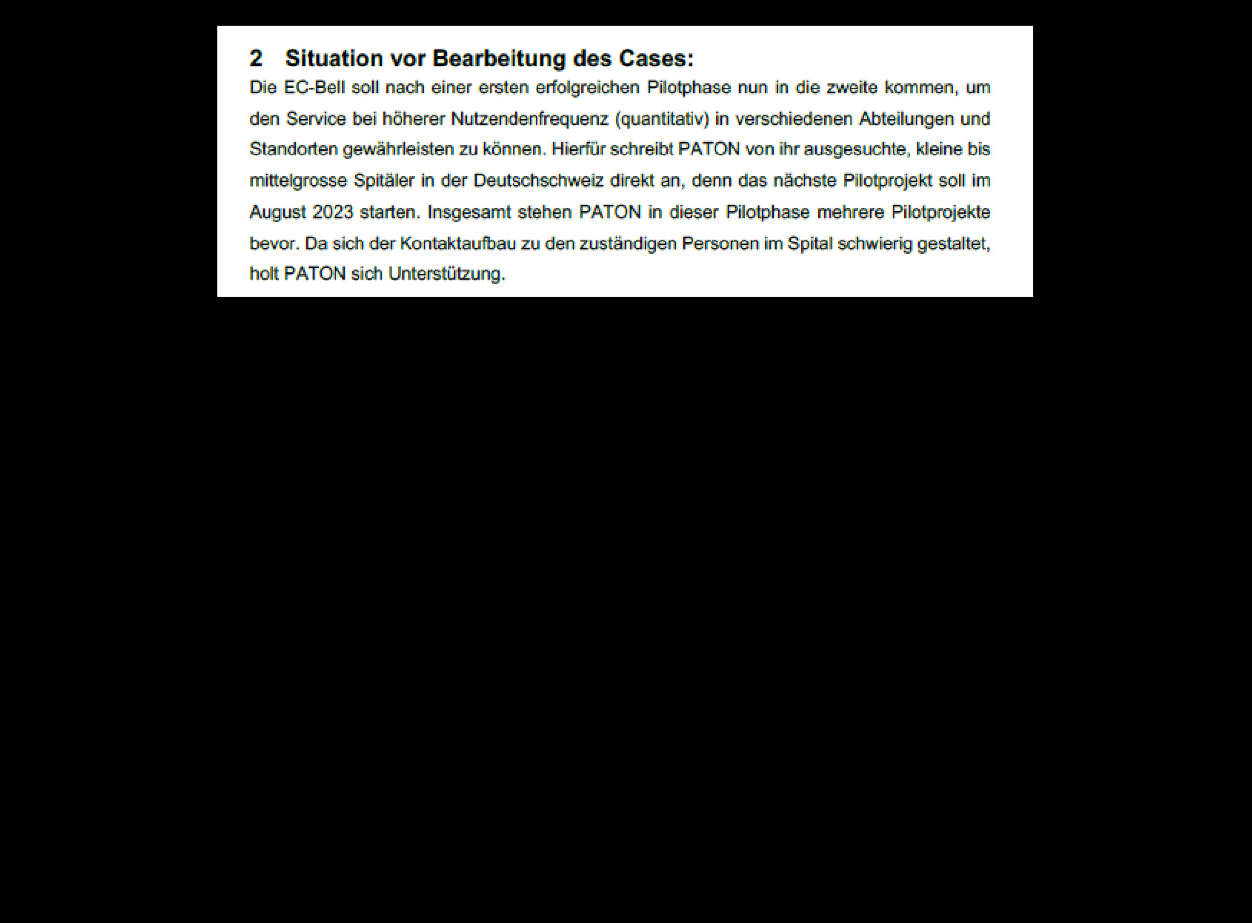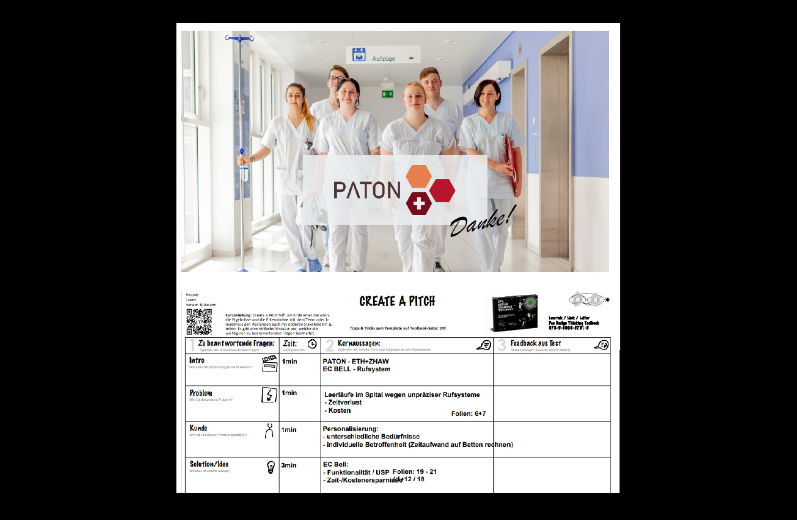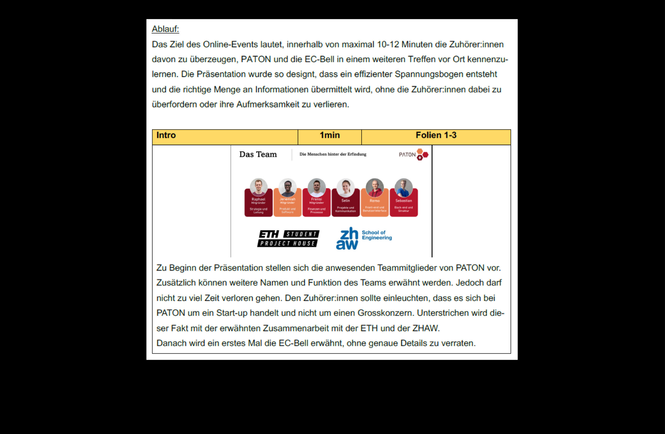 Einschätzungen von Studierenden zum Pitch: Anhand von Theorie und dem Erlerntem im Studium konnte die Projektgruppe für PATON einen effizienten Pitch für ihre Aquise-Events massschneidern. Die Aufteilung der wichtigsten Punkte eines Pitchs in Form von einer Tabelle vereinfacht die Wissensübertragung an den Auftragsgeber und verinnerlicht warum ein guter Spannungsbogen in einer Präsentation von grosser Wichtigkeit ist. Des Weiteren wurde der ganze Ablauf wie der Pitch für PATONs Produkt gestaltet werden soll in eine Art Storyboard dargestellt. Durch präzise Beschreibungen und gute Begründungen für die jeweiligen Inputs konnte das Projektteam ihr Fachwissen in Form von einer soliden Pitch-Beratung weitergeben.