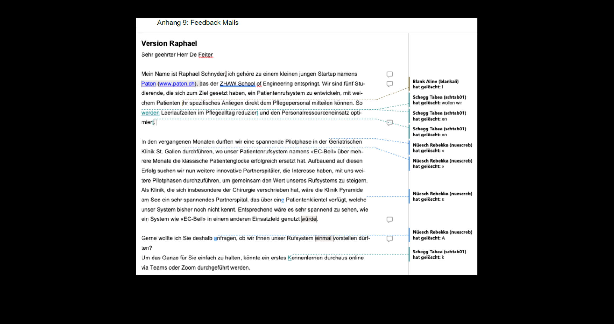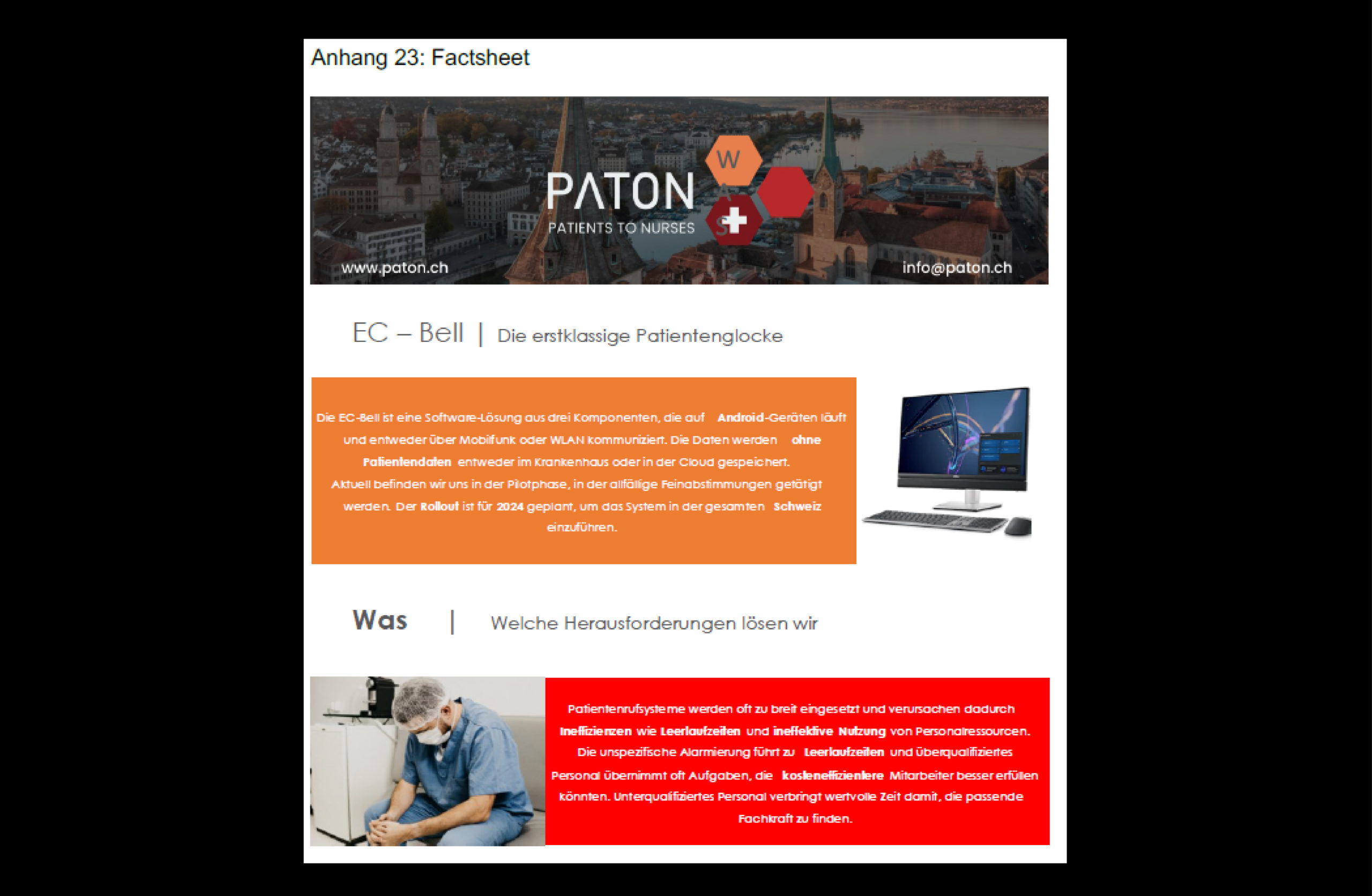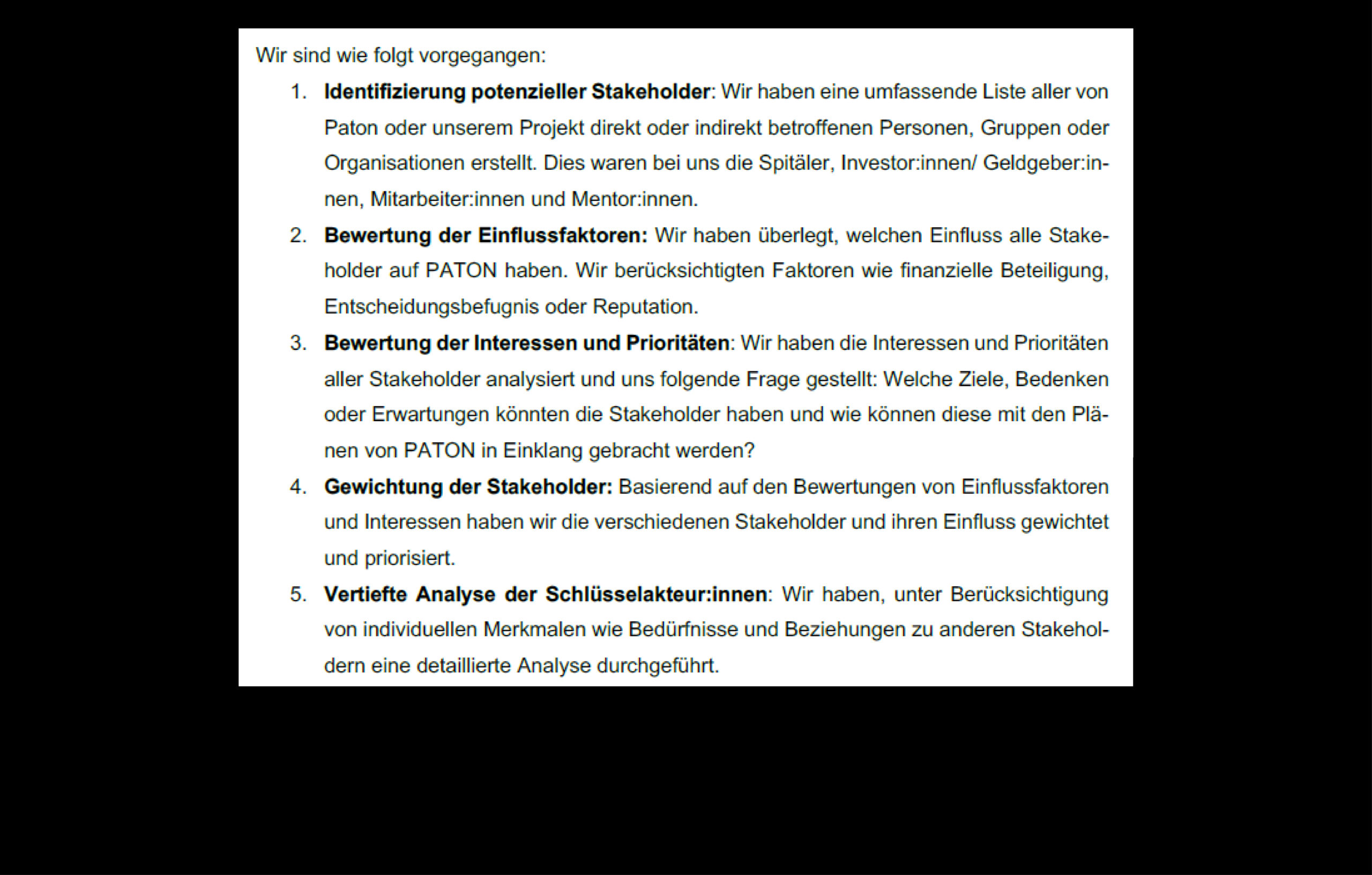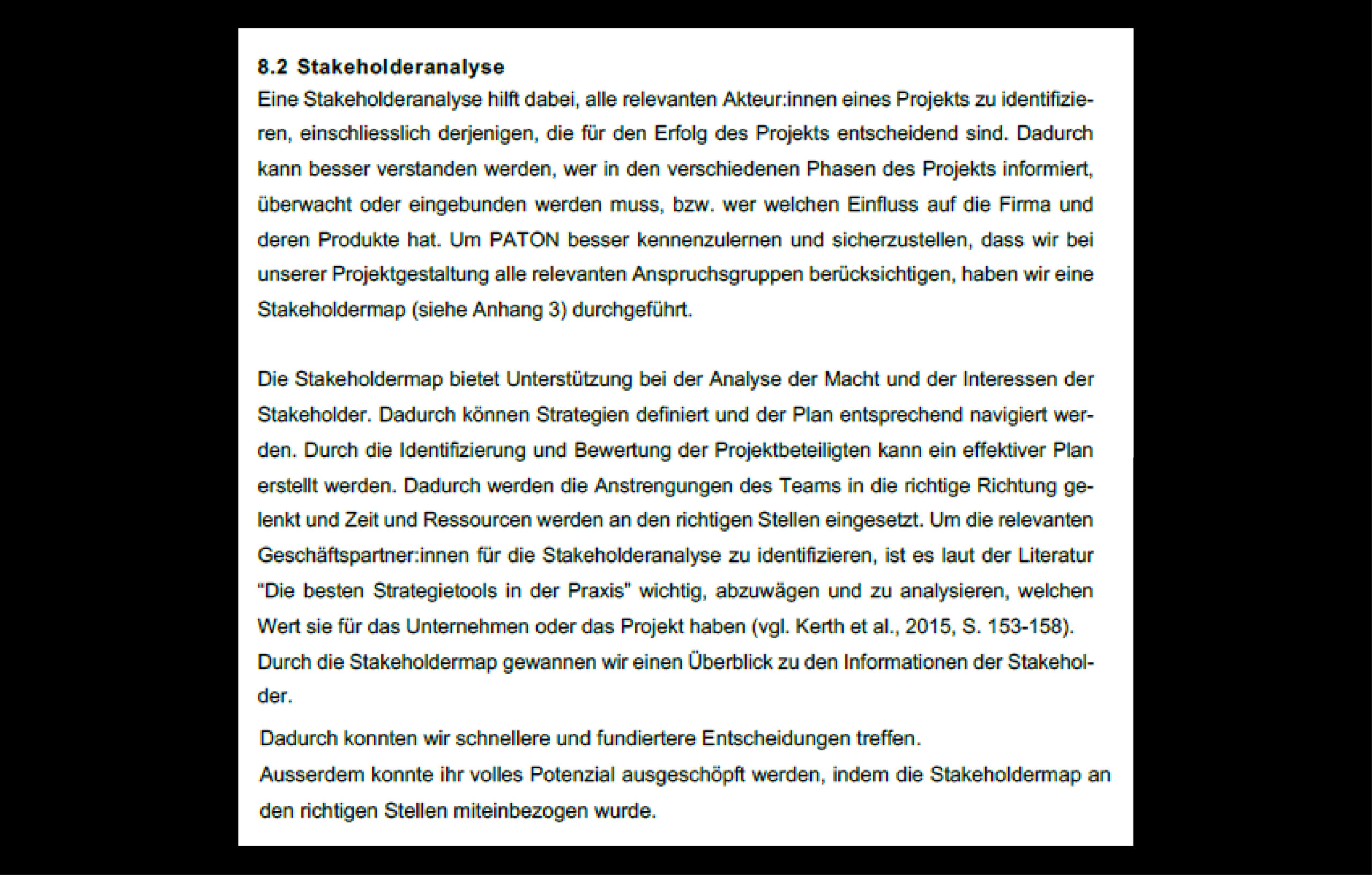 Einschätzungen von Studierenden zum Pitch: Anhand von Theorie und dem Erlerntem im Studium konnte die Projektgruppe für PATON einen effizienten Pitch für ihre Aquise-Events massschneidern. Die Aufteilung der wichtigsten Punkte eines Pitchs in Form von einer Tabelle vereinfacht die Wissensübertragung an den Auftragsgeber und verinnerlicht warum ein guter Spannungsbogen in einer Präsentation von grosser Wichtigkeit ist. Des Weiteren wurde der ganze Ablauf wie der Pitch für PATONs Produkt gestaltet werden soll in eine Art Storyboard dargestellt. Durch präzise Beschreibungen und gute Begründungen für die jeweiligen Inputs konnte das Projektteam ihr Fachwissen in Form von einer soliden Pitch-Beratung weitergeben.
