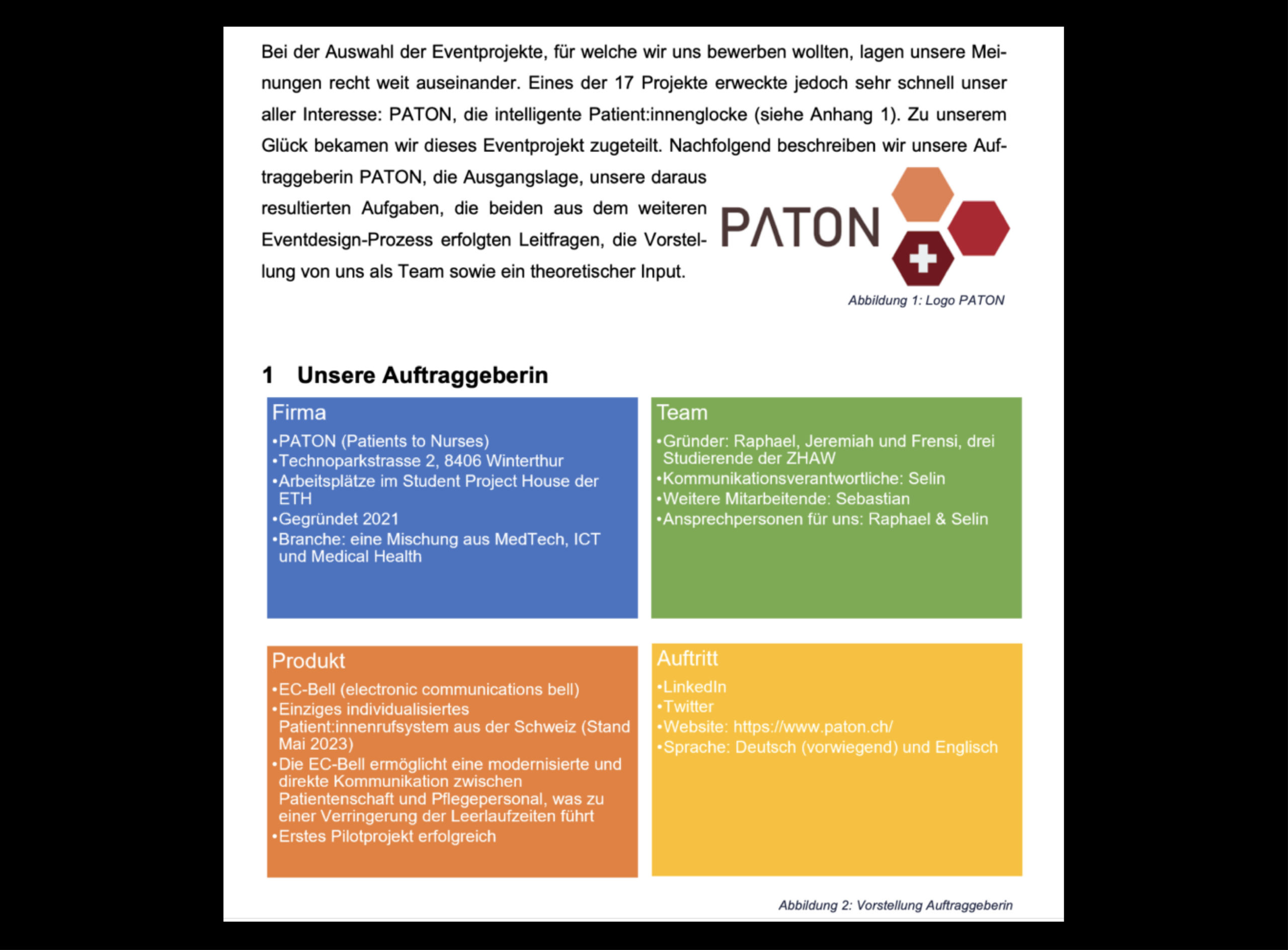 Das Team «Die Hutmacher» stellte sich im Rahmen dieses Pilotprojekts die Aufgabe, ein Promotionsevent im Gesundheitswesen für das Start-Up «PATON» zu gestalten. «PATON», ist im Bereich MedTech, ICT und Medical tätig. Mit ihrer EC-Bell – eine smarte Patient:innenglocke – können Patient:innen ihr individuelles Rufsystem haben. Dieses Pilotprojekt soll nun in Spitälern verkauft werden. Das Ziel des Eventdesign-Projekts war, das Produkt überzeugend zu verkaufen und neue Kund:innen zu aquirieren.