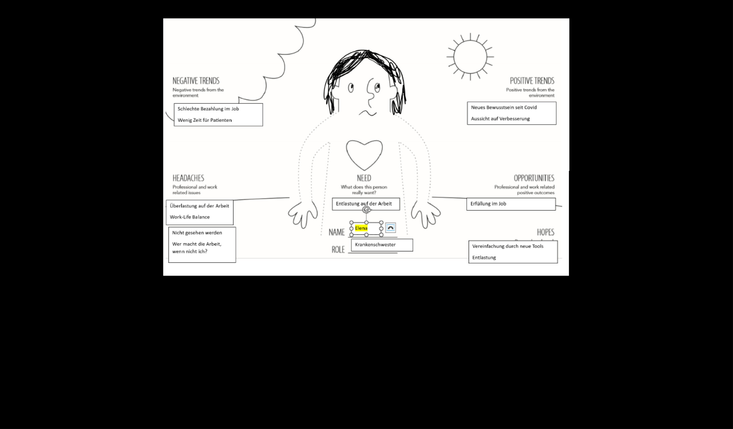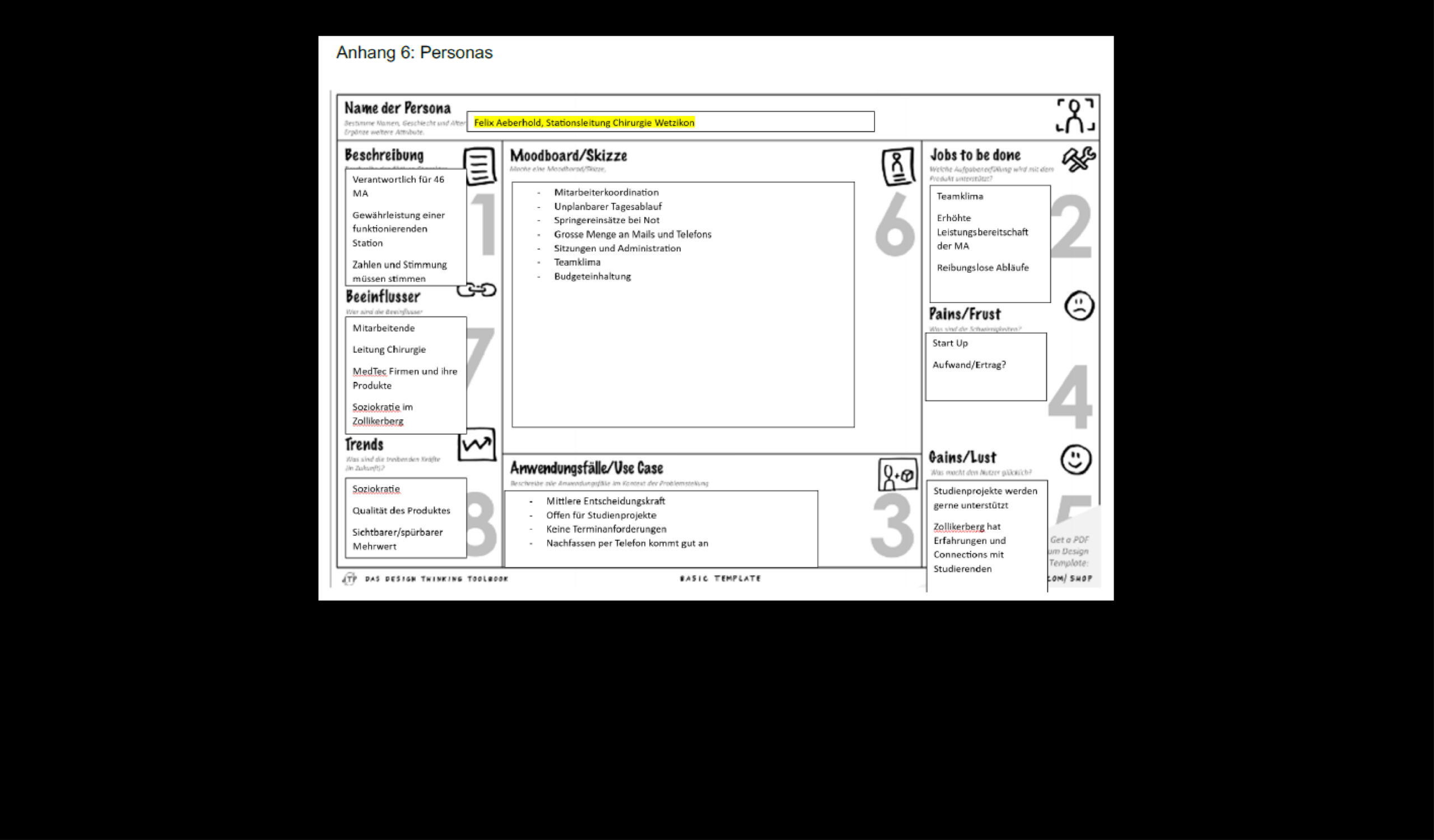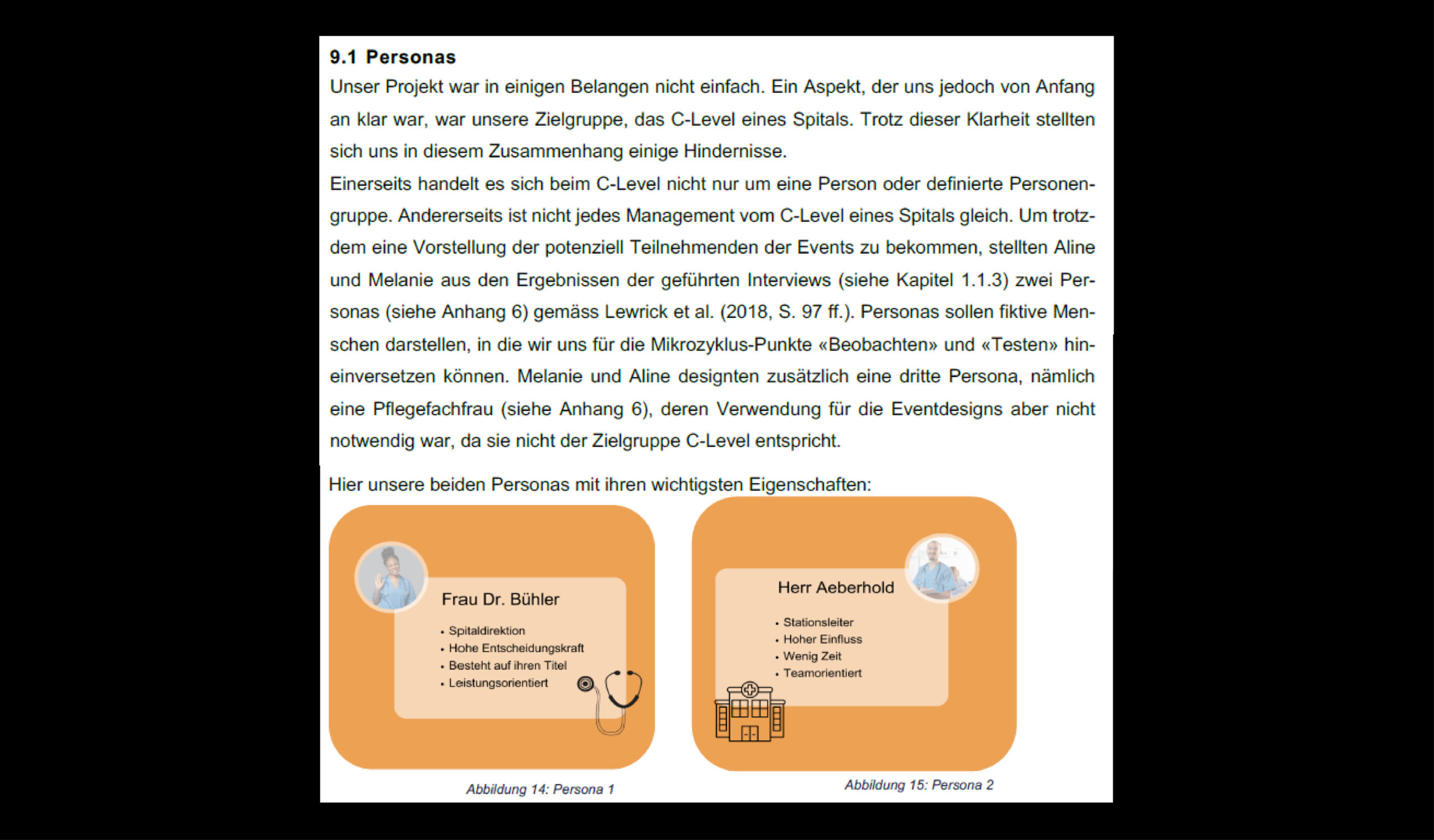 Einschätzungen von Studierenden zur Persona-Methode: Die Projektgruppe hat erfolgreich die Herausforderungen bei der Definition der Zielgruppe, speziell des C-Levels eines Spitals, bewältigt. Trotz der Vielschichtigkeit und Individualität dieser Zielgruppe gelang es dem Team, anhand der Interviewergebnisse präzise Personas zu erstellen. Diese Personas, basierend auf echten Personen, ermöglichten eine greifbare Vorstellung der potenziellen Teilnehmenden für die Events. Die kluge Entscheidung, eine dritte Persona (Pflegefachfrau) zu erstellen, zeigt ein weitergedachtes Vorgehen, auch wenn sie nicht direkt der Zielgruppe C-Level entspricht.