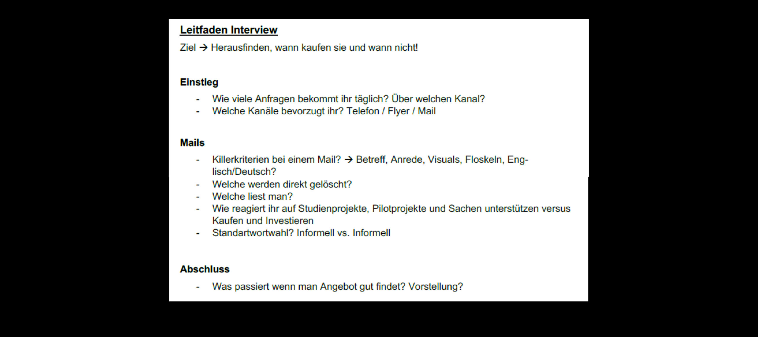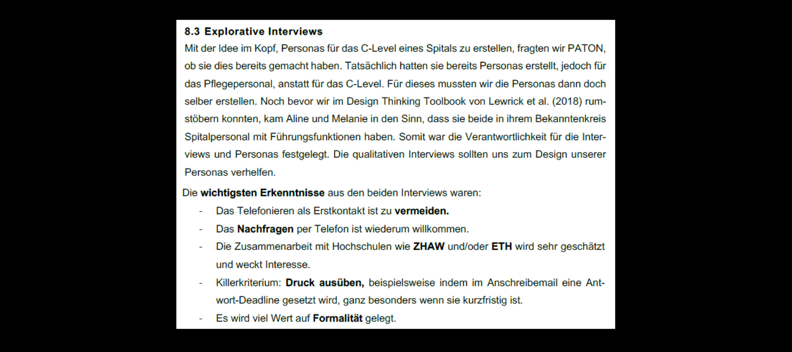 Einschätzungen von Studierenden zum explorativen Interview: Die Projektgruppe zeigte eine geschickte Herangehensweise bei der Durchführung von explorativen Interviews für das Eventprojekt PATON. Insbesondere fiel die gezielte Nutzung persönlicher Netzwerke auf, um Zugang zu relevanten C-Level-Kontakten im Spitalmanagement zu erhalten. Diese Strategie erwies sich als effizient und ermöglichte relevante Gespräche mit potenziellen Kund:innen. Die Entscheidung, das „Explorative Interview“ gegenüber dem „Interview for Empathy“ zu wählen, wurde gut begründet. Die Fokussierung auf die Bedürfnisse der Zielgruppe (C-Level) und das Vermeiden einer voreingenommenen Sichtweise auf ein noch nicht konkretisiertes Produkt zeugen von einer durchdachten strategischen Planung.