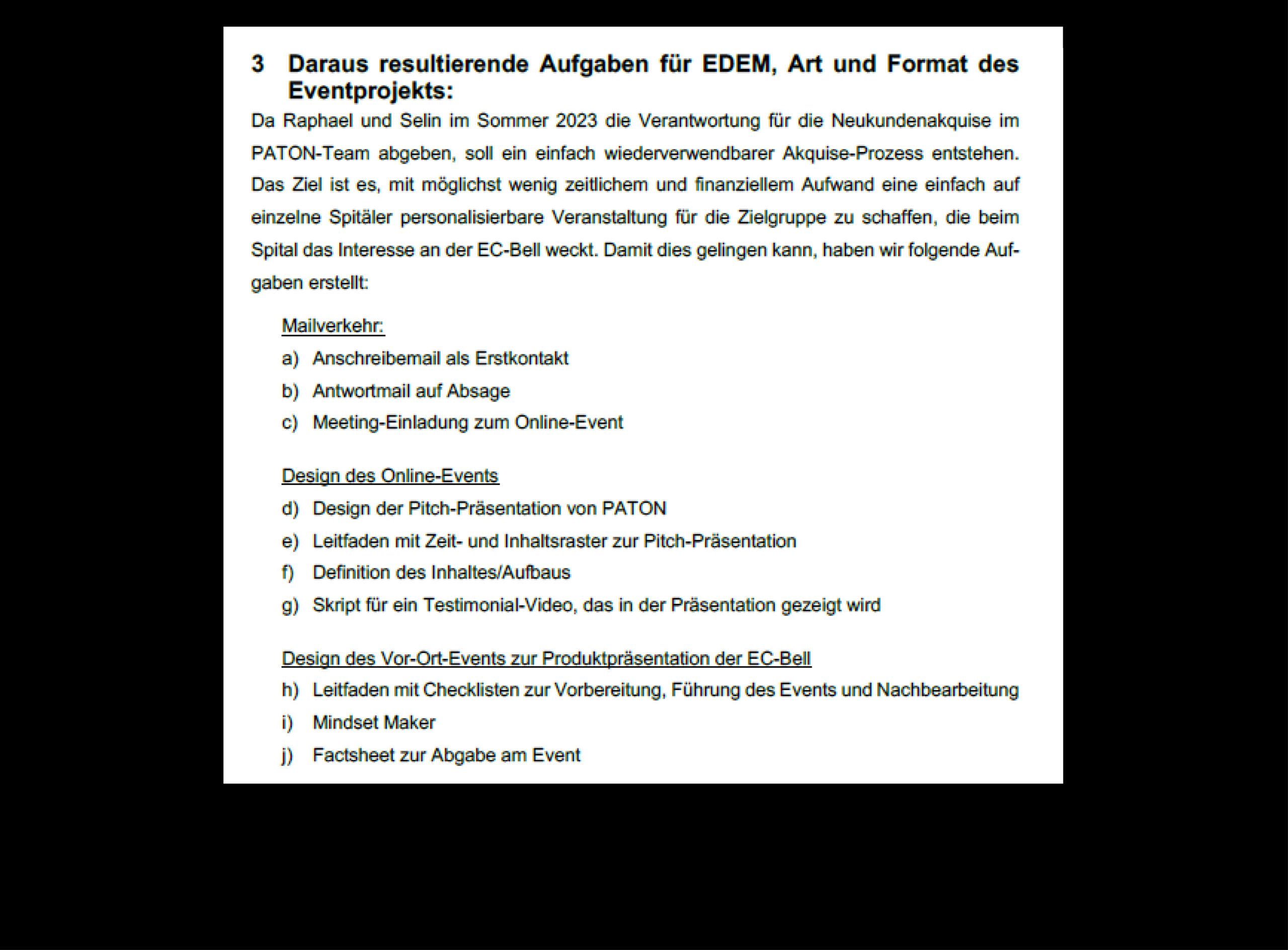 Einschätzungen von Studierenden zur Konzeptskizze: Die Konzeptskizze gibt einen klaren Überblick über die Ausgangslage, die Aufgabenstellung und den Kontext des Eventprojekts. Die beschriebenen Aufgaben, wie der Mailverkehr, das Design des Online-Events und des Vor-Ort-Events, werden strukturiert dargelegt. Es ist erkennbar, dass die Konzeptskizze auf die Herausforderungen der Neukundenakquise für die EC-Bell eingeht und klare Ziele für die Gestaltung des Events verfolgt. Dank der Darstellung der wesentlichen Kernpunkte des Auftagsgebers, erhält man als Leser:in eine kurze Übersicht was PATON ausmacht.