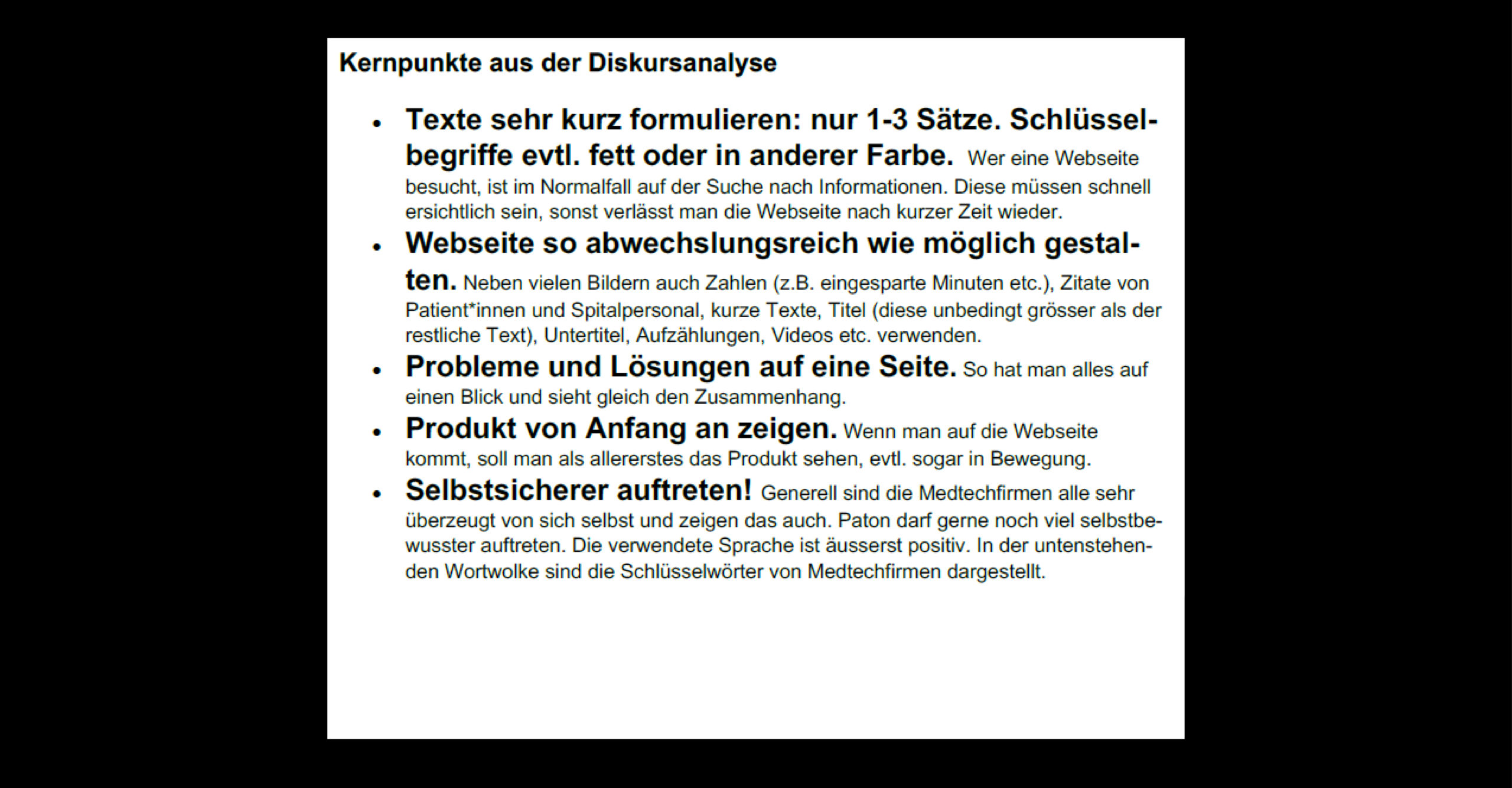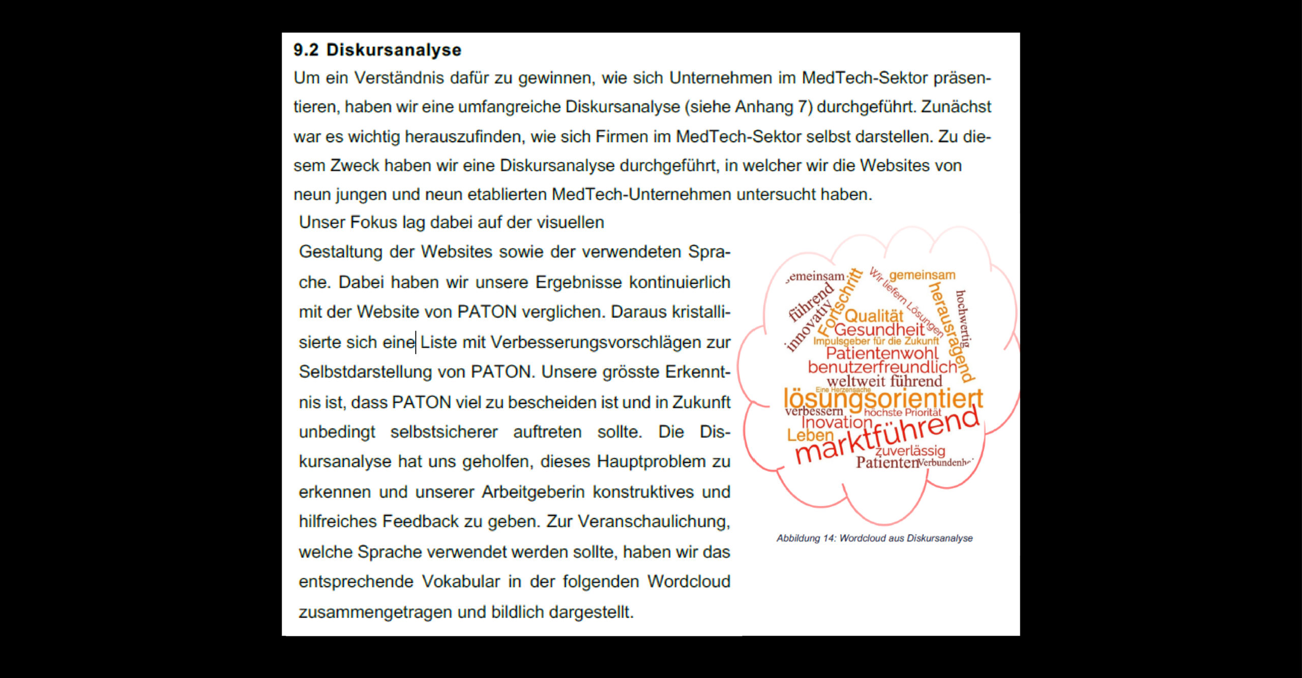 Einschätzungen von Studierenden zur Diskursanalyse: Die durchgeführte Diskursanalyse lieferte wertvolle Einblicke in die Selbstdarstellung von Unternehmen im MedTech-Sektor, insbesondere durch die Untersuchung von Websites von neun jungen und neun etablierten MedTech-Unternehmen. Der Fokus lag dabei auf der visuellen Gestaltung und der verwendeten Sprache, wobei kontinuierlich die neu gesammelten Erkenntnisse mit der Website von PATON abglichen wurde. Ein herausragendes Ergebnis war die Identifizierung von Verbesserungspotenzialen in der Selbstdarstellung von PATON, insbesondere in Bezug auf ihre Bescheidenheit. Demnach ermöglichte die Diskursanalyse der Projektgruppe, konstruktives und hilfreiches Feedback zu geben. Damit die Diskursnalyse ebenfalls einen visuellen Aspekt erhält, wurde ebenfalls eine Wordcloud mit den Diskursbegriffen erstellt. Anhand dieser gesammelten Begriffe kann nun eine präzisere Beratung gewährleistet werden als auch Designprodukte entstehen.