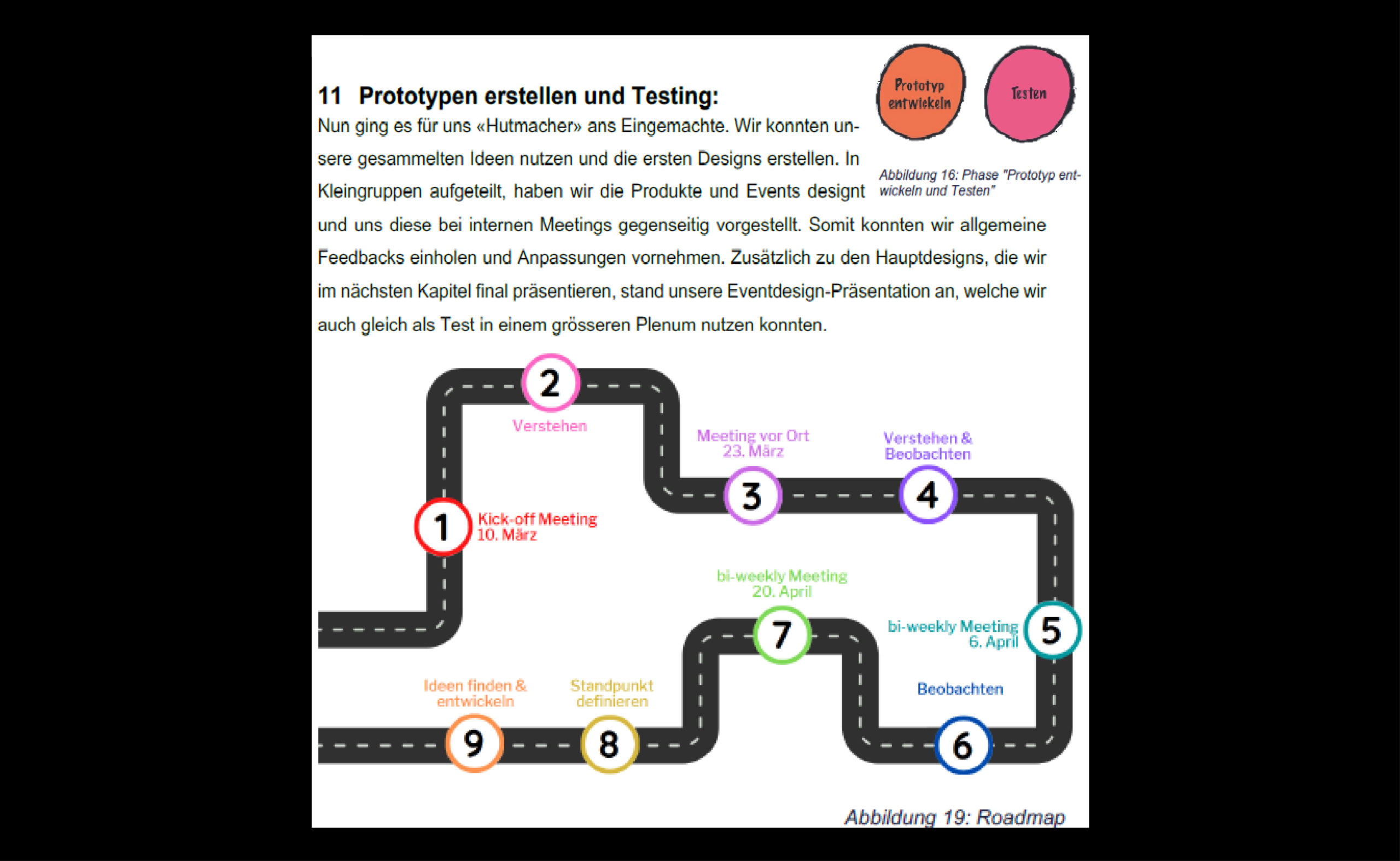 Einschätzungen von Studierenden zum Erstellen von Prototypen und zum Testing: Anders wie andere Projektgruppen fokusierte sich dieses Team auf eine schriftlichere Version des Design-Prozesses. Die Erstellung eines Roadmaps gibt zusätzlich einen Überblick, wie der Verlauf des Projekts gestaltet wird und welche Etappe als nächstes an steht. Die oben gezeigte Ausschnitte sollen zeigen, dass es keine singuläre Herangehensweise gibt, sondern die Erarbeitung und das Designen eines Events vielfältig gestaltet werden kann. Schlussendlich ist es wichtig, dass es im Rahmen der Projektarbeit eine Sinnhaftigkeit gibt, die für alle Beteiligten im Projektteam stimmig ist.