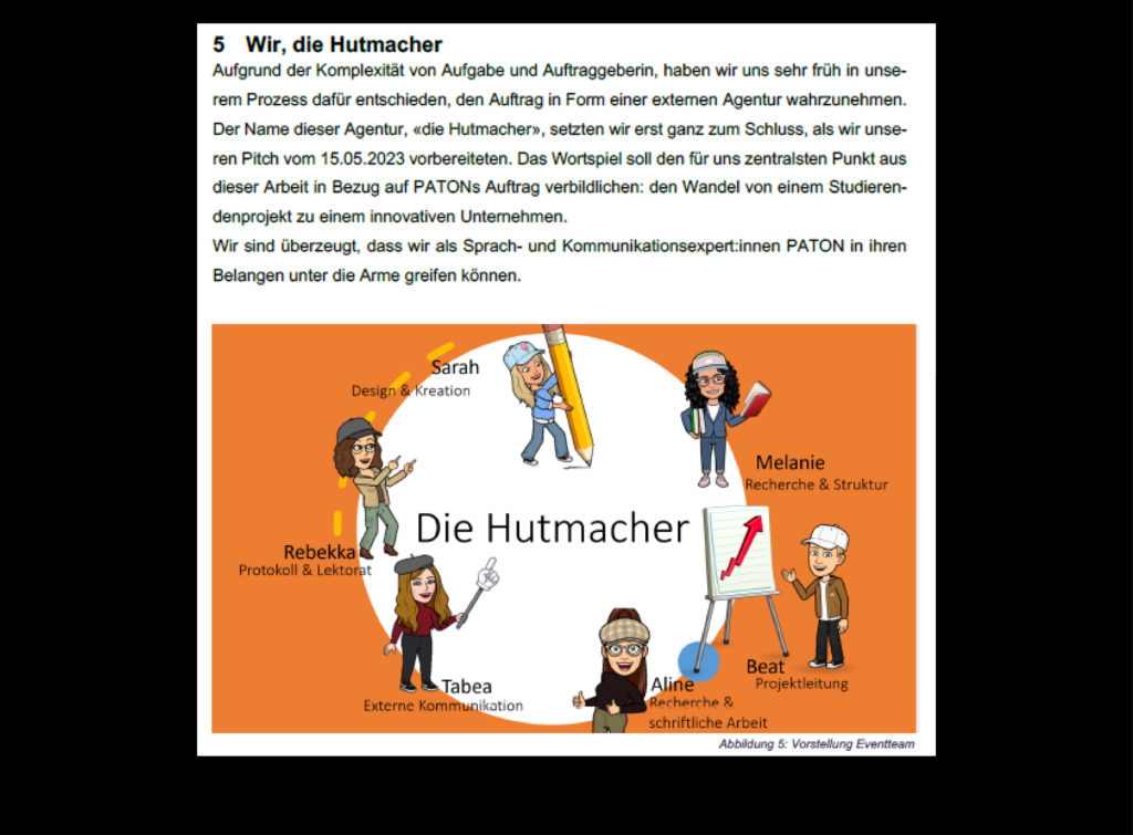 Das Management Summary kann auch in Form eines Designposters gestaltet sein. Es kann vor dem ersten Kapitel z.B. als Bilddatei eingefügt werden. Das Projektteam «Die Hutmacher» haben das Management Summary wie folgt umgesetzt: