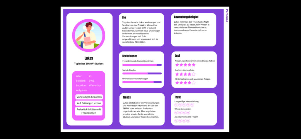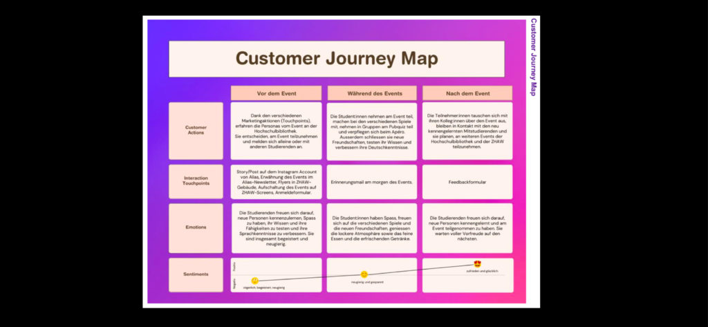 Einschätzungen von Studierenden zur Persona-Methode: Dies ist eines der Personas, die für diesen Event designt wurde. Bei der Erstellung von Personas ist es wichtig, relevante demografische Informationen wie Alter, Geschlecht und Bildungsniveau zu berücksichtigen. Desweiteren sollten die beruflichen Hintergründe – in diesem Fall Student:in – Motivationen und Bedürfnisse der Persona analysiert werden. Es ist entscheidend, die Kommunikationspräferenzen, hier in Form von Beeinflusser und Trends sowie technologische Affinitäten der Persona zu erfassen, um eine effektive Ansprache sicherzustellen. Aus den Personas wurde in einem nächsten Schritt eine Vielzahl an Eventdesign-Produkten erstellt, die auf das Verhalten der Persona angepasst wurde. Als weitere Methode dienen auch Customer Journey Maps.
