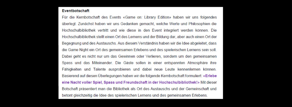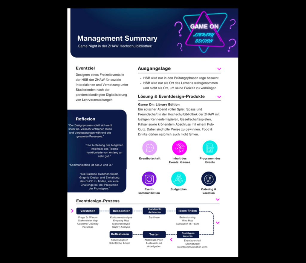 Einschätzungen von Studierenden zum Management Summary: Ein gutes Management Summary sollte eine kurze, prägnante Darstellung des Events bieten, welche die wichtigsten Aspekte und Ziele zusammenfasst. Es sollte die Ausgangslage skizzieren (Konzeptskizze), die eigentliche Eventdesign-Aufgabe (hier: Eventziel) formulieren sowie die hervorgebrachten Eventdesign-Produkte (Lösungen) benennen. Relevant ist zudem die Rekonstruktion des Eventdesign-Prozesses, die Aufschluss geben über die eingesetzten Designpraktiken und Methoden sowie zugrundeliegende Daten (wie etwa Interview- oder Umfragedaten, Websitetexte, etc.). Hightlights aus den Reflexionen im Team runden das Management Summary ab. Das vorliegende Beispiel demonstriert ein visuell attraktiv gestaltetes Management Summary in Form eines Designposters. Thematisch hebt es sich durch die kreative Umgestaltung der Hochschulbibliothek in einen sozialen Treffpunkt hervor, der über das übliche Verständnis eines Lernortes hinausgeht. Die Integration von Spielen und sozialen Aktivitäten hebt das Event als einzigartiges Erlebnis hervor und führt den Lesenden die wichtigsten Anhaltspunkte auf.