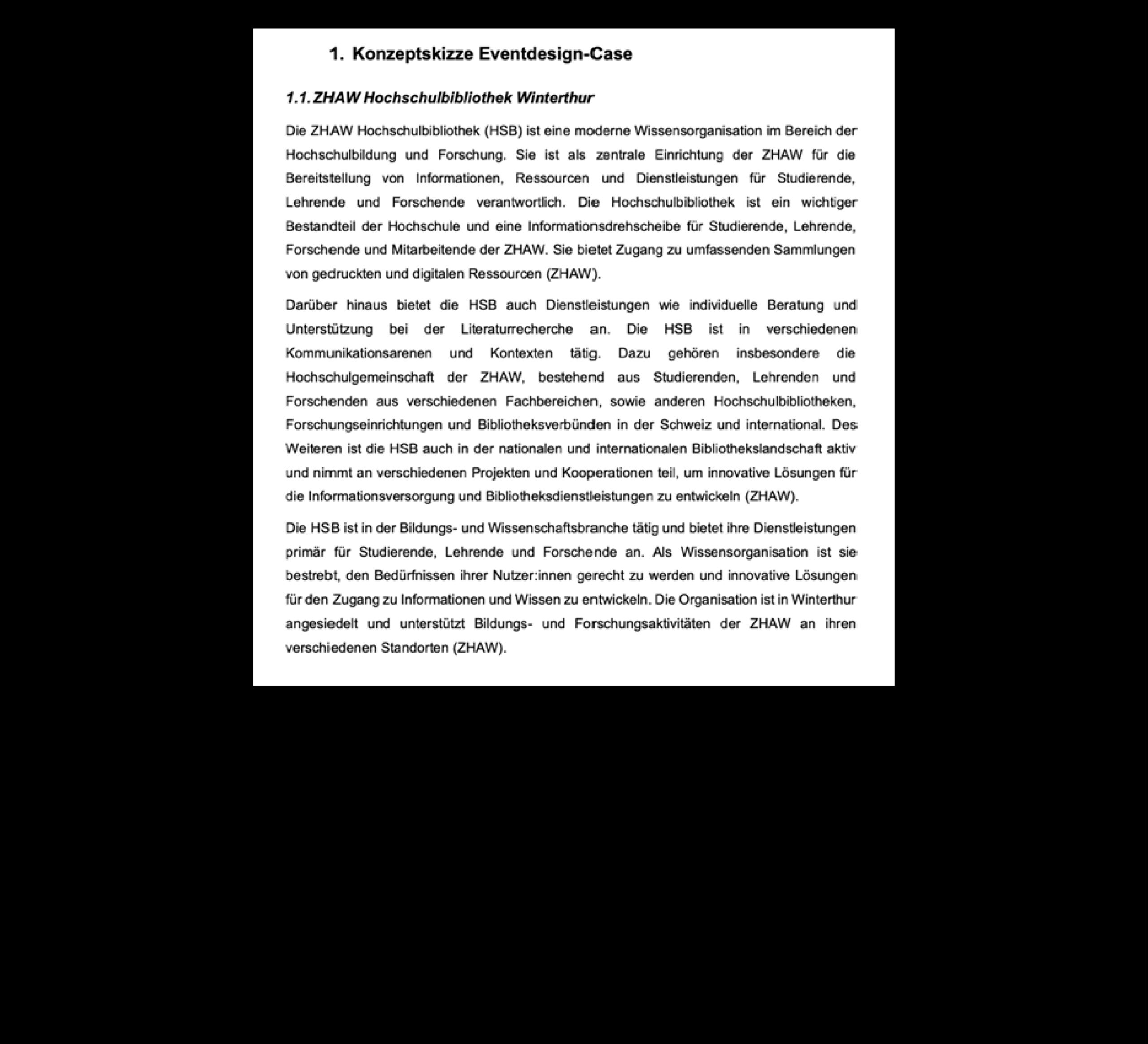 Einschätzungen von Studierenden zum Interview und Rollenwechsel: In der Eventorganisation ist es entscheidend zu erkennen, dass die Anwendbarkeit und Effektivität analytischer Methoden stark vom jeweiligen Event-Case abhängen. Jedes Event ist einzigartig, und somit können einige Analysewerkzeuge besser geeignet sein, um spezifische Herausforderungen und Chancen zu identifizieren, während andere weniger relevant sind. Die Wahl „stimmiger“ (nicht richtiger) analytischer Designmethoden sollte daher stets auf den spezifischen Kontext und die Eventdesign-Aufgabe des individuellen Event-Cases abgestimmt sein. Die Mitglieder des Projektteams haben sich in diesem Fall gegen ein Interview mit der Audience (Zielpublikum) entschieden, weil sie die Bedürfnisse von Studierenden an der ZHAW als selber Studierende vergleichweise gut kennen.
