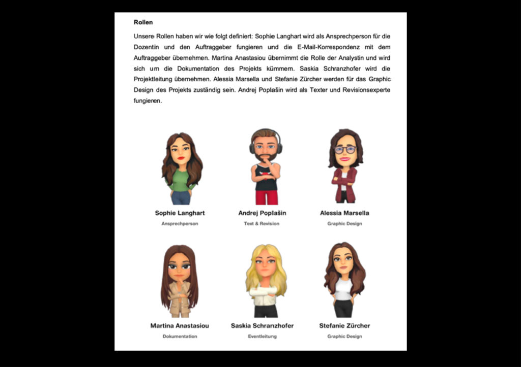 Einschätzungen von Studierenden zur Rollenverteilung: Im Prozess des Event-Designs empfiehlt es sich, die Rollen der Teammitglieder nach ihren Stärken zu verteilen. Gibt es in der Gruppe eine fleissige Schreiberin? Wer kennt sich mit grafischen Tools aus? Das sind nur einige Fragen, die im Team beantwortet werden können. Eine gut durchdachte Rollenverteilung vereinfacht den fortlaufenden Prozess des Projekts, die Eventdesign-Aufgabe mehrperspektivisch, d.h. aus unterschiedlichen Rollen heraus zu bearbeiten.
