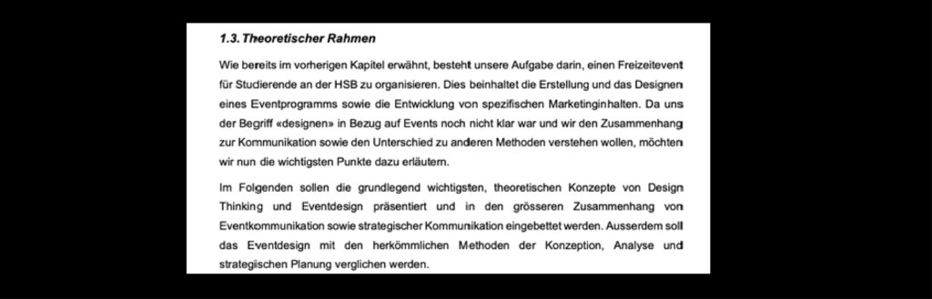 - Theoretische Verortung ausgewählter Kernbegriffe und Schlüsselkonzepte von Design sowie Erläuterungen und Begründungen zu den vom jeweiligen Eventteam genutzten Prinzipien und Haltungen bei der Bearbeitung des Eventprojekts