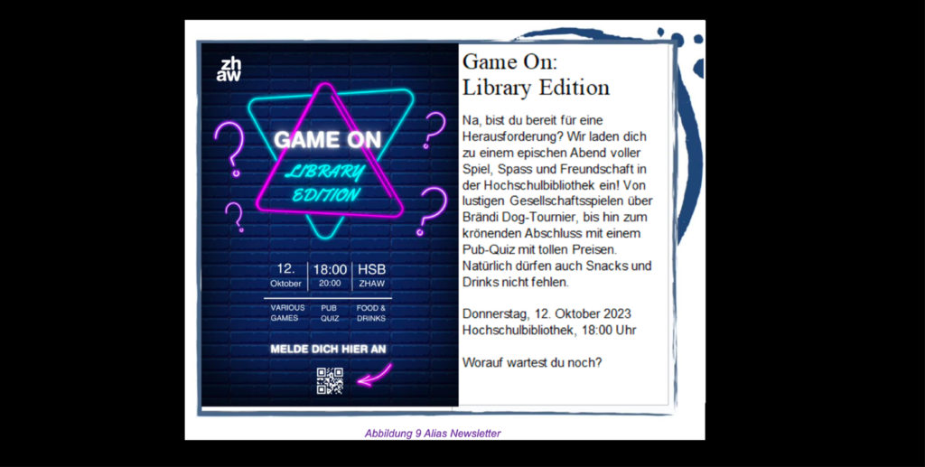 Einschätzungen von Studierenden zum Newsletter: Auch hier sieht man wieder die zielgruppengerechte Kommunikation. Die Zusammenarbeit mit der ZHAW Studentenvereinigung Alias hat sich für die Gestaltung dieses Events bewährt. Dank der Zusammenarbeit war es möglich, eine erhöhte Reichweite für den bevorstehenden Event zu erreichen. Die Kooperation stärkt auch die Beziehung zu einer wertvollen Partnerin für zukünftige Events. Der Text punktet, indem er die einfache Sprache favorisiert, direkt, spannend und ansprechend geschrieben wurde. Er enthält die wichtigsten Informationen zum Event und endet mit einem Call-to-Action.