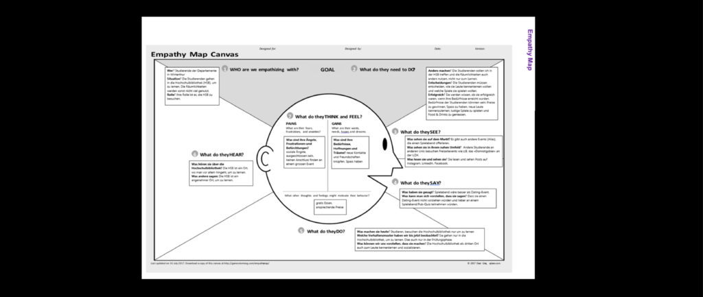 Einschätzungen von Studierenden zur Empathy Map: Eine Empathy Map ist hilfreich, um ein besseres Verständnis für die Bedürfnisse, Perspektiven, Motivationen und Emotionen der Nutzer:innen zu entwickeln. Sie ermöglicht es, sich empathisch in die Zielgruppe hineinzuversetzen und Lösungen zu entwickeln, die auf ihre Bedürfnisse zugeschnitten sind. Durch den Einsatz der Empathy Map konnte das Team fundierte Designentscheidungen treffen und die Perspektive der Besucher:innen besser berücksichtigen. Durch den Perspektivwechsel und das Hineinversetzen in die Situation oder Perspektive einer Person der relevanten Audience kann eine präzisere und vereinfachtere Darstellung von so genannten Personas gelingen.
