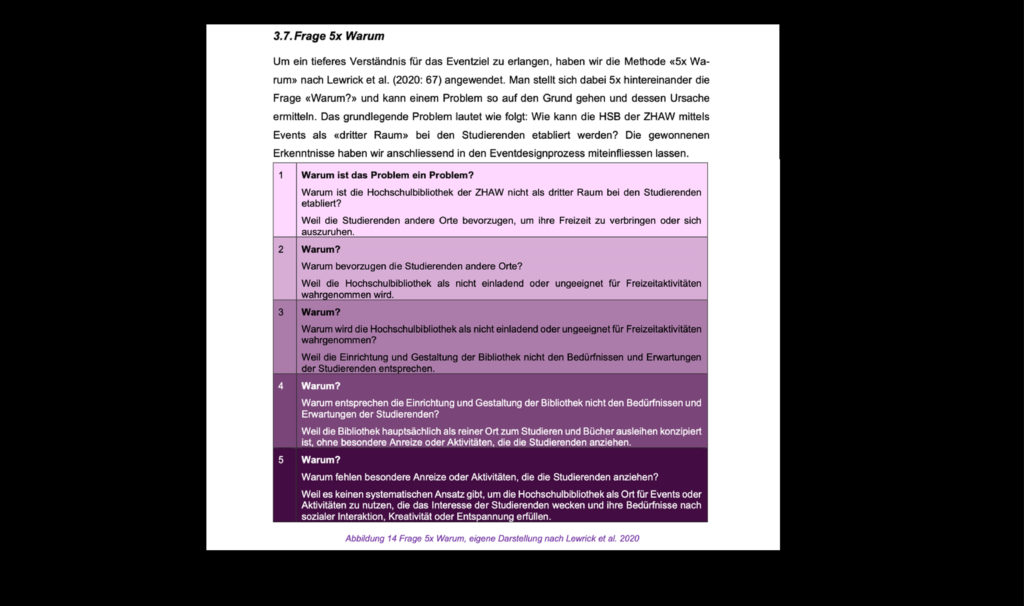Einschätzungen von Studierenden zur 5x Warum-Methode: Die 5x Warum-Methode wurde hier systematisch umgesetzt, da sie systematisch die Ursachen hinter dem Problem der fehlenden Etablierung der Hochschulbibliothek als dritter Raum bei den Studierenden aufdeckt. Jeder Schritt geht tiefer in die Analyse und Identifikation der zugrunde liegenden Ursachen, was eine fundierte Grundlage für gezielte Lösungen schafft. Durch diese Methode wird ein umfassendes Verständnis des Problems erreicht. Die Methode ermöglicht es, spezifische Massnahmen zur Verbesserung der Einrichtung und Gestaltung der Bibliothek zu ergreifen.